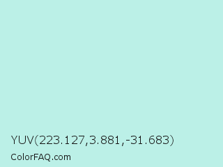 YUV 223.127,3.881,-31.683 Color is a very light cyan color and the nearest color is Mint Tulip #c4f4eb. Hex code #bbf0e7 and RGB value is rgb(187,240,231). In RGB color space, this color is composed of 73% red, 94% green, 91% blue, In CMYK color space, this color is composed of 22% cyan, 0% magenta, 4% yellow , 6% black , In HSL color space, this color has a hue angle of 170° , 64% saturation and 84% lightness.