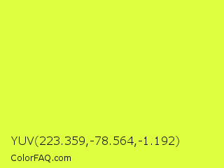 YUV 223.359,-78.564,-1.192 Color is a light yellow color and the nearest color is Starship #ecf245. Hex code #deff40 and RGB value is rgb(222,255,64). In RGB color space, this color is composed of 87% red, 100% green, 25% blue, In CMYK color space, this color is composed of 13% cyan, 0% magenta, 75% yellow , 0% black , In HSL color space, this color has a hue angle of 70° , 100% saturation and 63% lightness.