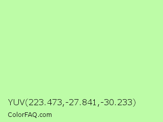 YUV 223.473,-27.841,-30.233 Color is a very light green color and the nearest color is Reef #c9ffa2. Hex code #bdfca7 and RGB value is rgb(189,252,167). In RGB color space, this color is composed of 74% red, 99% green, 65% blue, In CMYK color space, this color is composed of 25% cyan, 0% magenta, 34% yellow , 1% black , In HSL color space, this color has a hue angle of 104° , 93% saturation and 82% lightness.