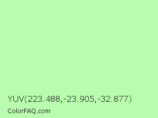 YUV 223.488,-23.905,-32.877 Color is a very light green color and the nearest color is Madang #b7f0be. Hex code #bafcaf and RGB value is rgb(186,252,175). In RGB color space, this color is composed of 73% red, 99% green, 69% blue, In CMYK color space, this color is composed of 26% cyan, 0% magenta, 31% yellow , 1% black , In HSL color space, this color has a hue angle of 111° , 93% saturation and 84% lightness.