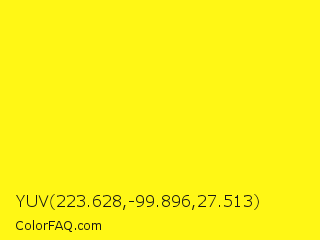 YUV 223.628,-99.896,27.513 Color is a normal yellow color and the nearest color is Broom #ffec13. Hex code #fff715 and RGB value is rgb(255,247,21). In RGB color space, this color is composed of 100% red, 97% green, 8% blue, In CMYK color space, this color is composed of 0% cyan, 3% magenta, 92% yellow , 0% black , In HSL color space, this color has a hue angle of 58° , 100% saturation and 54% lightness.