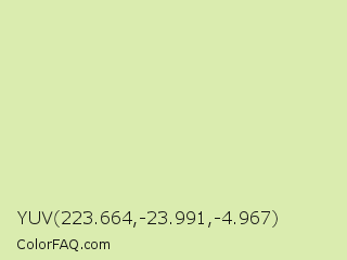 YUV 223.664,-23.991,-4.967 Color is a very light lime color and the nearest color is Caper #dcedb4. Hex code #daecaf and RGB value is rgb(218,236,175). In RGB color space, this color is composed of 85% red, 93% green, 69% blue, In CMYK color space, this color is composed of 8% cyan, 0% magenta, 26% yellow , 7% black , In HSL color space, this color has a hue angle of 78° , 62% saturation and 81% lightness.