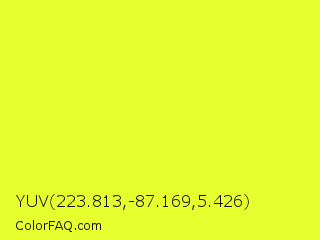 YUV 223.813,-87.169,5.426 Color is a normal yellow color and the nearest color is Golden Fizz #f5fb3d. Hex code #e6ff2f and RGB value is rgb(230,255,47). In RGB color space, this color is composed of 90% red, 100% green, 18% blue, In CMYK color space, this color is composed of 10% cyan, 0% magenta, 82% yellow , 0% black , In HSL color space, this color has a hue angle of 67° , 100% saturation and 59% lightness.