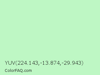 YUV 224.143,-13.874,-29.943 Color is a very light green color and the nearest color is Madang #b7f0be. Hex code #bef7c4 and RGB value is rgb(190,247,196). In RGB color space, this color is composed of 75% red, 97% green, 77% blue, In CMYK color space, this color is composed of 23% cyan, 0% magenta, 21% yellow , 3% black , In HSL color space, this color has a hue angle of 126° , 78% saturation and 86% lightness.