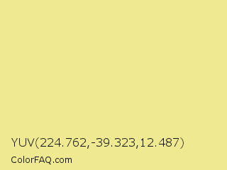 YUV 224.762,-39.323,12.487 Color is a light yellow color and the nearest color is Khaki #f0e68c. Hex code #efe991 and RGB value is rgb(239,233,145). In RGB color space, this color is composed of 94% red, 91% green, 57% blue, In CMYK color space, this color is composed of 0% cyan, 3% magenta, 39% yellow , 6% black , In HSL color space, this color has a hue angle of 56° , 75% saturation and 75% lightness.
