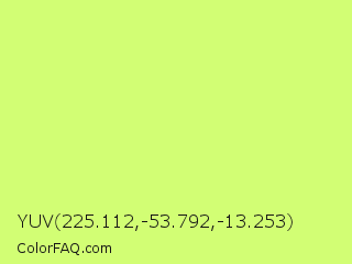 YUV 225.112,-53.792,-13.253 Color is a light lime color and the nearest color is Sulu #c1f07c. Hex code #d2fe74 and RGB value is rgb(210,254,116). In RGB color space, this color is composed of 82% red, 100% green, 45% blue, In CMYK color space, this color is composed of 17% cyan, 0% magenta, 54% yellow , 0% black , In HSL color space, this color has a hue angle of 79° , 99% saturation and 73% lightness.