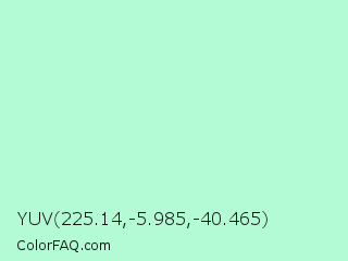 YUV 225.14,-5.985,-40.465 Color is a very light green color and the nearest color is Magic Mint #aaf0d1. Hex code #b3fbd5 and RGB value is rgb(179,251,213). In RGB color space, this color is composed of 70% red, 98% green, 84% blue, In CMYK color space, this color is composed of 29% cyan, 0% magenta, 15% yellow , 2% black , In HSL color space, this color has a hue angle of 148° , 90% saturation and 84% lightness.
