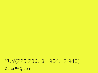 YUV 225.236,-81.954,12.948 Color is a light yellow color and the nearest color is Golden Fizz #f5fb3d. Hex code #f0fa3b and RGB value is rgb(240,250,59). In RGB color space, this color is composed of 94% red, 98% green, 23% blue, In CMYK color space, this color is composed of 4% cyan, 0% magenta, 76% yellow , 2% black , In HSL color space, this color has a hue angle of 63° , 95% saturation and 61% lightness.