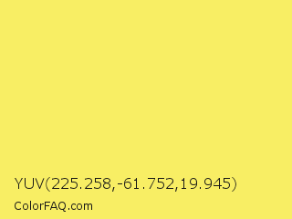 YUV 225.258,-61.752,19.945 Color is a light yellow color and the nearest color is Candy Corn #fbec5d. Hex code #f8ee64 and RGB value is rgb(248,238,100). In RGB color space, this color is composed of 97% red, 93% green, 39% blue, In CMYK color space, this color is composed of 0% cyan, 4% magenta, 60% yellow , 3% black , In HSL color space, this color has a hue angle of 56° , 91% saturation and 68% lightness.
