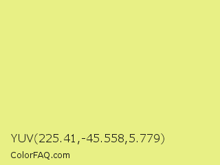 YUV 225.41,-45.558,5.779 Color is a light yellow color and the nearest color is Key Lime #e8f48c. Hex code #e8f085 and RGB value is rgb(232,240,133). In RGB color space, this color is composed of 91% red, 94% green, 52% blue, In CMYK color space, this color is composed of 3% cyan, 0% magenta, 45% yellow , 6% black , In HSL color space, this color has a hue angle of 64° , 78% saturation and 73% lightness.