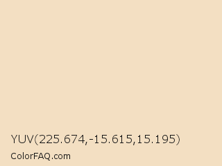 YUV 225.674,-15.615,15.195 Color is a very light orange color and the nearest color is Givry #f8e4bf. Hex code #f3dfc2 and RGB value is rgb(243,223,194). In RGB color space, this color is composed of 95% red, 87% green, 76% blue, In CMYK color space, this color is composed of 0% cyan, 8% magenta, 20% yellow , 5% black , In HSL color space, this color has a hue angle of 36° , 67% saturation and 86% lightness.