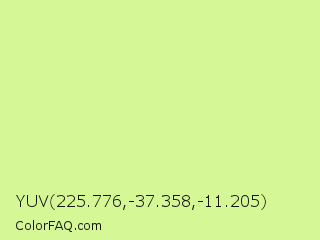 YUV 225.776,-37.358,-11.205 Color is a light green color and the nearest color is Reef #c9ffa2. Hex code #d5f796 and RGB value is rgb(213,247,150). In RGB color space, this color is composed of 84% red, 97% green, 59% blue, In CMYK color space, this color is composed of 14% cyan, 0% magenta, 39% yellow , 3% black , In HSL color space, this color has a hue angle of 81° , 86% saturation and 78% lightness.