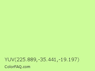 YUV 225.889,-35.441,-19.197 Color is a light green color and the nearest color is Reef #c9ffa2. Hex code #ccfb9a and RGB value is rgb(204,251,154). In RGB color space, this color is composed of 80% red, 98% green, 60% blue, In CMYK color space, this color is composed of 19% cyan, 0% magenta, 39% yellow , 2% black , In HSL color space, this color has a hue angle of 89° , 92% saturation and 79% lightness.