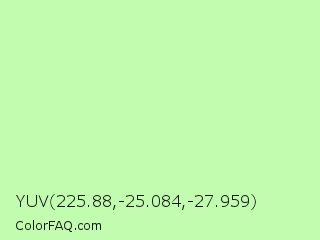 YUV 225.88,-25.084,-27.959 Color is a very light green color and the nearest color is Reef #c9ffa2. Hex code #c2fcaf and RGB value is rgb(194,252,175). In RGB color space, this color is composed of 76% red, 99% green, 69% blue, In CMYK color space, this color is composed of 23% cyan, 0% magenta, 31% yellow , 1% black , In HSL color space, this color has a hue angle of 105° , 93% saturation and 84% lightness.