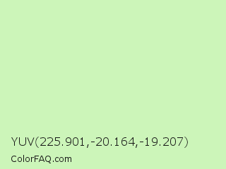 YUV 225.901,-20.164,-19.207 Color is a very light green color and the nearest color is Tea Green #d0f0c0. Hex code #ccf5b9 and RGB value is rgb(204,245,185). In RGB color space, this color is composed of 80% red, 96% green, 73% blue, In CMYK color space, this color is composed of 17% cyan, 0% magenta, 24% yellow , 4% black , In HSL color space, this color has a hue angle of 101° , 75% saturation and 84% lightness.