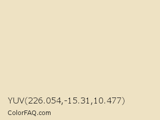 YUV 226.054,-15.31,10.477 Color is a very light orange color and the nearest color is Pearl #eae0c8. Hex code #eee2c3 and RGB value is rgb(238,226,195). In RGB color space, this color is composed of 93% red, 89% green, 76% blue, In CMYK color space, this color is composed of 0% cyan, 5% magenta, 18% yellow , 7% black , In HSL color space, this color has a hue angle of 43° , 56% saturation and 85% lightness.