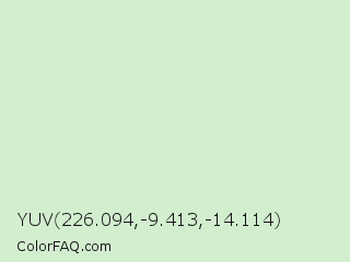 YUV 226.094,-9.413,-14.114 Color is a very light green color and the nearest color is Surf Crest #cfe5d2. Hex code #d2eecf and RGB value is rgb(210,238,207). In RGB color space, this color is composed of 82% red, 93% green, 81% blue, In CMYK color space, this color is composed of 12% cyan, 0% magenta, 13% yellow , 7% black , In HSL color space, this color has a hue angle of 114° , 48% saturation and 87% lightness.