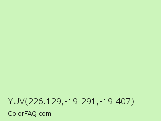 YUV 226.129,-19.291,-19.407 Color is a very light green color and the nearest color is Tea Green #d0f0c0. Hex code #ccf5bb and RGB value is rgb(204,245,187). In RGB color space, this color is composed of 80% red, 96% green, 73% blue, In CMYK color space, this color is composed of 17% cyan, 0% magenta, 24% yellow , 4% black , In HSL color space, this color has a hue angle of 102° , 74% saturation and 85% lightness.
