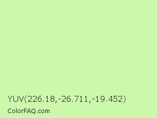 YUV 226.18,-26.711,-19.452 Color is a very light green color and the nearest color is Gossip #d2f8b0. Hex code #ccf8ac and RGB value is rgb(204,248,172). In RGB color space, this color is composed of 80% red, 97% green, 67% blue, In CMYK color space, this color is composed of 18% cyan, 0% magenta, 31% yellow , 3% black , In HSL color space, this color has a hue angle of 95° , 84% saturation and 82% lightness.