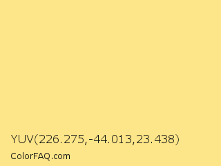 YUV 226.275,-44.013,23.438 Color is a light yellow color and the nearest color is Sweet Corn #fbea8c. Hex code #fde689 and RGB value is rgb(253,230,137). In RGB color space, this color is composed of 99% red, 90% green, 54% blue, In CMYK color space, this color is composed of 0% cyan, 9% magenta, 46% yellow , 1% black , In HSL color space, this color has a hue angle of 48° , 97% saturation and 76% lightness.