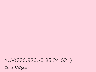 YUV 226.926,-0.95,24.621 Color is a very light rose color and the nearest color is Pig Pink #fdd7e4. Hex code #ffd5e1 and RGB value is rgb(255,213,225). In RGB color space, this color is composed of 100% red, 84% green, 88% blue, In CMYK color space, this color is composed of 0% cyan, 16% magenta, 12% yellow , 0% black , In HSL color space, this color has a hue angle of 343° , 100% saturation and 92% lightness.