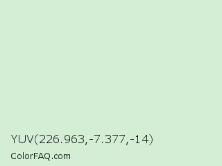 YUV 226.963,-7.377,-14 Color is a very light green color and the nearest color is Zanah #daecd6. Hex code #d3eed4 and RGB value is rgb(211,238,212). In RGB color space, this color is composed of 83% red, 93% green, 83% blue, In CMYK color space, this color is composed of 11% cyan, 0% magenta, 11% yellow , 7% black , In HSL color space, this color has a hue angle of 122° , 44% saturation and 88% lightness.