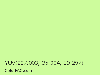 YUV 227.003,-35.004,-19.297 Color is a light green color and the nearest color is Reef #c9ffa2. Hex code #cdfc9c and RGB value is rgb(205,252,156). In RGB color space, this color is composed of 80% red, 99% green, 61% blue, In CMYK color space, this color is composed of 19% cyan, 0% magenta, 38% yellow , 1% black , In HSL color space, this color has a hue angle of 89° , 94% saturation and 80% lightness.