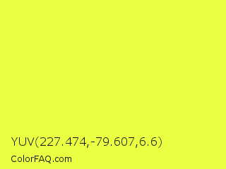 YUV 227.474,-79.607,6.6 Color is a light yellow color and the nearest color is Golden Fizz #f5fb3d. Hex code #ebff42 and RGB value is rgb(235,255,66). In RGB color space, this color is composed of 92% red, 100% green, 26% blue, In CMYK color space, this color is composed of 8% cyan, 0% magenta, 74% yellow , 0% black , In HSL color space, this color has a hue angle of 66° , 100% saturation and 63% lightness.
