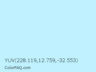 YUV 228.119,12.759,-32.553 Color is a very light cyan color and the nearest color is French Pass #bdedfd. Hex code #bff2fe and RGB value is rgb(191,242,254). In RGB color space, this color is composed of 75% red, 95% green, 100% blue, In CMYK color space, this color is composed of 25% cyan, 5% magenta, 0% yellow , 0% black , In HSL color space, this color has a hue angle of 191° , 97% saturation and 87% lightness.