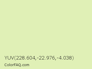 YUV 228.604,-22.976,-4.038 Color is a very light lime color and the nearest color is Caper #dcedb4. Hex code #e0f0b6 and RGB value is rgb(224,240,182). In RGB color space, this color is composed of 88% red, 94% green, 71% blue, In CMYK color space, this color is composed of 7% cyan, 0% magenta, 24% yellow , 6% black , In HSL color space, this color has a hue angle of 77° , 66% saturation and 83% lightness.