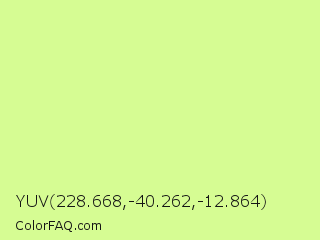 YUV 228.668,-40.262,-12.864 Color is a light green color and the nearest color is Mindaro #e3f988. Hex code #d6fc93 and RGB value is rgb(214,252,147). In RGB color space, this color is composed of 84% red, 99% green, 58% blue, In CMYK color space, this color is composed of 15% cyan, 0% magenta, 42% yellow , 1% black , In HSL color space, this color has a hue angle of 82° , 95% saturation and 78% lightness.