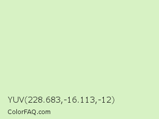 YUV 228.683,-16.113,-12 Color is a very light green color and the nearest color is Tea Green #d0f0c0. Hex code #d7f2c4 and RGB value is rgb(215,242,196). In RGB color space, this color is composed of 84% red, 95% green, 77% blue, In CMYK color space, this color is composed of 11% cyan, 0% magenta, 19% yellow , 5% black , In HSL color space, this color has a hue angle of 95° , 64% saturation and 86% lightness.