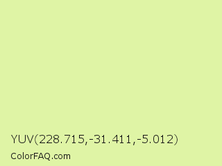 YUV 228.715,-31.411,-5.012 Color is a light lime color and the nearest color is Caper #dcedb4. Hex code #dff4a5 and RGB value is rgb(223,244,165). In RGB color space, this color is composed of 87% red, 96% green, 65% blue, In CMYK color space, this color is composed of 9% cyan, 0% magenta, 32% yellow , 4% black , In HSL color space, this color has a hue angle of 76° , 78% saturation and 80% lightness.