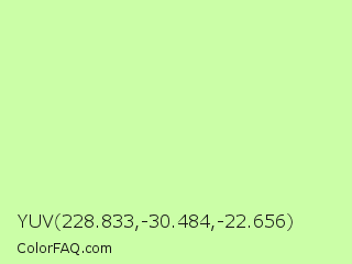 YUV 228.833,-30.484,-22.656 Color is a very light green color and the nearest color is Reef #c9ffa2. Hex code #cbfea7 and RGB value is rgb(203,254,167). In RGB color space, this color is composed of 80% red, 100% green, 65% blue, In CMYK color space, this color is composed of 20% cyan, 0% magenta, 34% yellow , 0% black , In HSL color space, this color has a hue angle of 95° , 98% saturation and 83% lightness.