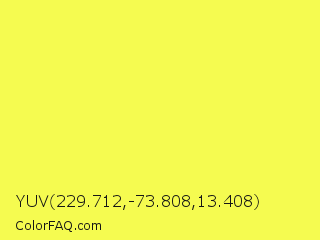 YUV 229.712,-73.808,13.408 Color is a light yellow color and the nearest color is Lemon Yellow #fff44f. Hex code #f5fb50 and RGB value is rgb(245,251,80). In RGB color space, this color is composed of 96% red, 98% green, 31% blue, In CMYK color space, this color is composed of 2% cyan, 0% magenta, 68% yellow , 2% black , In HSL color space, this color has a hue angle of 62° , 96% saturation and 65% lightness.