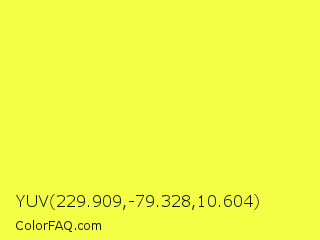 YUV 229.909,-79.328,10.604 Color is a light yellow color and the nearest color is Golden Fizz #f5fb3d. Hex code #f2ff45 and RGB value is rgb(242,255,69). In RGB color space, this color is composed of 95% red, 100% green, 27% blue, In CMYK color space, this color is composed of 5% cyan, 0% magenta, 73% yellow , 0% black , In HSL color space, this color has a hue angle of 64° , 100% saturation and 64% lightness.