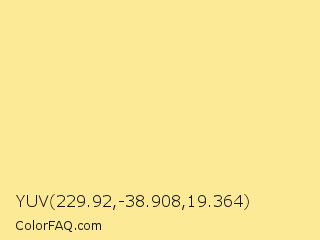YUV 229.92,-38.908,19.364 Color is a light yellow color and the nearest color is Golden Glow #fde295. Hex code #fcea97 and RGB value is rgb(252,234,151). In RGB color space, this color is composed of 99% red, 92% green, 59% blue, In CMYK color space, this color is composed of 0% cyan, 7% magenta, 40% yellow , 1% black , In HSL color space, this color has a hue angle of 49° , 94% saturation and 79% lightness.