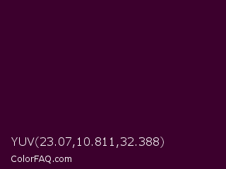 YUV 23.07,10.811,32.388 Color is a very dark magenta color and the nearest color is Barossa #44012d. Hex code #3c002d and RGB value is rgb(60,-0,45). In RGB color space, this color is composed of 24% red, 0% green, 18% blue, In CMYK color space, this color is composed of 0% cyan, 100% magenta, 25% yellow , 76% black , In HSL color space, this color has a hue angle of 315° , 100% saturation and 12% lightness.