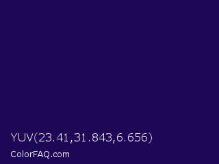 YUV 23.41,31.843,6.656 Color is a very dark indigo color and the nearest color is Cherry Pie #2a0359. Hex code #1f0758 and RGB value is rgb(31,7,88). In RGB color space, this color is composed of 12% red, 3% green, 35% blue, In CMYK color space, this color is composed of 65% cyan, 92% magenta, 0% yellow , 65% black , In HSL color space, this color has a hue angle of 258° , 85% saturation and 19% lightness.