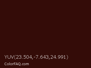 YUV 23.504,-7.643,24.991 Color is a very dark red color and the nearest color is Rebel #3c1206. Hex code #340c08 and RGB value is rgb(52,12,8). In RGB color space, this color is composed of 20% red, 5% green, 3% blue, In CMYK color space, this color is composed of 0% cyan, 77% magenta, 85% yellow , 80% black , In HSL color space, this color has a hue angle of 5° , 73% saturation and 12% lightness.