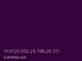 YUV 23.932,16.796,26.37 Color is a very dark magenta color and the nearest color is Mardi Gras #350036. Hex code #36023a and RGB value is rgb(54,2,58). In RGB color space, this color is composed of 21% red, 1% green, 23% blue, In CMYK color space, this color is composed of 7% cyan, 97% magenta, 0% yellow , 77% black , In HSL color space, this color has a hue angle of 296° , 93% saturation and 12% lightness.