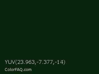 YUV 23.963,-7.377,-14 Color is a almost black green color and the nearest color is Palm Green #09230f. Hex code #082309 and RGB value is rgb(8,35,9). In RGB color space, this color is composed of 3% red, 14% green, 4% blue, In CMYK color space, this color is composed of 77% cyan, 0% magenta, 74% yellow , 86% black , In HSL color space, this color has a hue angle of 122° , 63% saturation and 8% lightness.