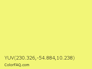 YUV 230.326,-54.884,10.238 Color is a light yellow color and the nearest color is Sunny #f2f27a. Hex code #f2f677 and RGB value is rgb(242,246,119). In RGB color space, this color is composed of 95% red, 96% green, 47% blue, In CMYK color space, this color is composed of 2% cyan, 0% magenta, 52% yellow , 4% black , In HSL color space, this color has a hue angle of 62° , 88% saturation and 72% lightness.