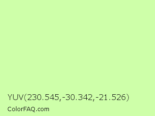 YUV 230.545,-30.342,-21.526 Color is a very light green color and the nearest color is Reef #c9ffa2. Hex code #ceffa9 and RGB value is rgb(206,255,169). In RGB color space, this color is composed of 81% red, 100% green, 66% blue, In CMYK color space, this color is composed of 19% cyan, 0% magenta, 34% yellow , 0% black , In HSL color space, this color has a hue angle of 94° , 100% saturation and 83% lightness.