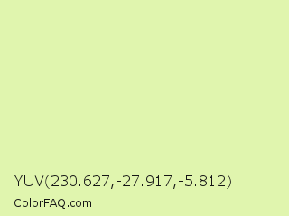 YUV 230.627,-27.917,-5.812 Color is a very light lime color and the nearest color is Caper #dcedb4. Hex code #e0f5ae and RGB value is rgb(224,245,174). In RGB color space, this color is composed of 88% red, 96% green, 68% blue, In CMYK color space, this color is composed of 9% cyan, 0% magenta, 29% yellow , 4% black , In HSL color space, this color has a hue angle of 78° , 78% saturation and 82% lightness.
