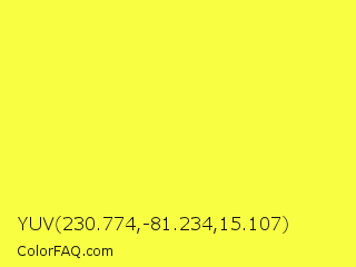 YUV 230.774,-81.234,15.107 Color is a light yellow color and the nearest color is Golden Fizz #f5fb3d. Hex code #f8fe42 and RGB value is rgb(248,254,66). In RGB color space, this color is composed of 97% red, 100% green, 26% blue, In CMYK color space, this color is composed of 2% cyan, 0% magenta, 74% yellow , 0% black , In HSL color space, this color has a hue angle of 62° , 99% saturation and 63% lightness.