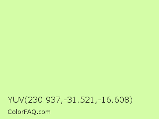 YUV 230.937,-31.521,-16.608 Color is a very light green color and the nearest color is Gossip #d2f8b0. Hex code #d4fda7 and RGB value is rgb(212,253,167). In RGB color space, this color is composed of 83% red, 99% green, 65% blue, In CMYK color space, this color is composed of 16% cyan, 0% magenta, 34% yellow , 1% black , In HSL color space, this color has a hue angle of 89° , 96% saturation and 82% lightness.