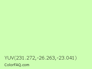 YUV 231.272,-26.263,-23.041 Color is a very light green color and the nearest color is Gossip #d2f8b0. Hex code #cdffb2 and RGB value is rgb(205,255,178). In RGB color space, this color is composed of 80% red, 100% green, 70% blue, In CMYK color space, this color is composed of 20% cyan, 0% magenta, 30% yellow , 0% black , In HSL color space, this color has a hue angle of 99° , 100% saturation and 85% lightness.