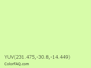 YUV 231.475,-30.8,-14.449 Color is a very light green color and the nearest color is Gossip #d2f8b0. Hex code #d7fca9 and RGB value is rgb(215,252,169). In RGB color space, this color is composed of 84% red, 99% green, 66% blue, In CMYK color space, this color is composed of 15% cyan, 0% magenta, 33% yellow , 1% black , In HSL color space, this color has a hue angle of 87° , 93% saturation and 83% lightness.