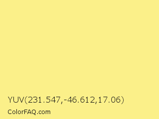 YUV 231.547,-46.612,17.06 Color is a light yellow color and the nearest color is Sweet Corn #fbea8c. Hex code #fbf089 and RGB value is rgb(251,240,137). In RGB color space, this color is composed of 98% red, 94% green, 54% blue, In CMYK color space, this color is composed of 0% cyan, 4% magenta, 45% yellow , 2% black , In HSL color space, this color has a hue angle of 54° , 93% saturation and 76% lightness.
